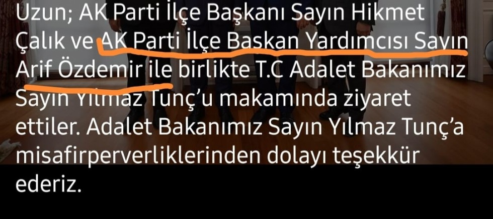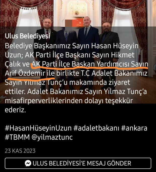 Ak Parti İl Başkanı Yaşar Arslan,a yönelttiğimiz" AK Parti'nin Ulus İlçe başkan yardımcısı görevi ve belediyesi sosyal medya hesabında görevli olan ( A.Ö ) isimli şahsın aldığı mahkumiyet kararını hüküm giydiği suç itibariyle nasıl değerlendiriyorsunuz sorumuz üzerine şunları özetlledi.Yaşar Arslan " Konuyla ilgili bilgim yoktu şahıs istifasını vermişti şahsın işlediği hukuki kusurları kendini bağlar partimize etkisi olamaz" dedi